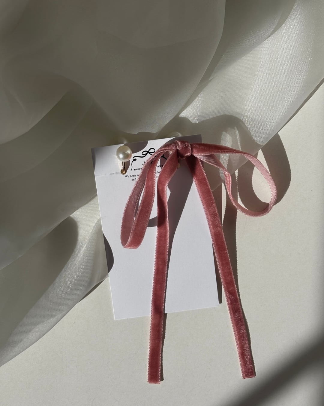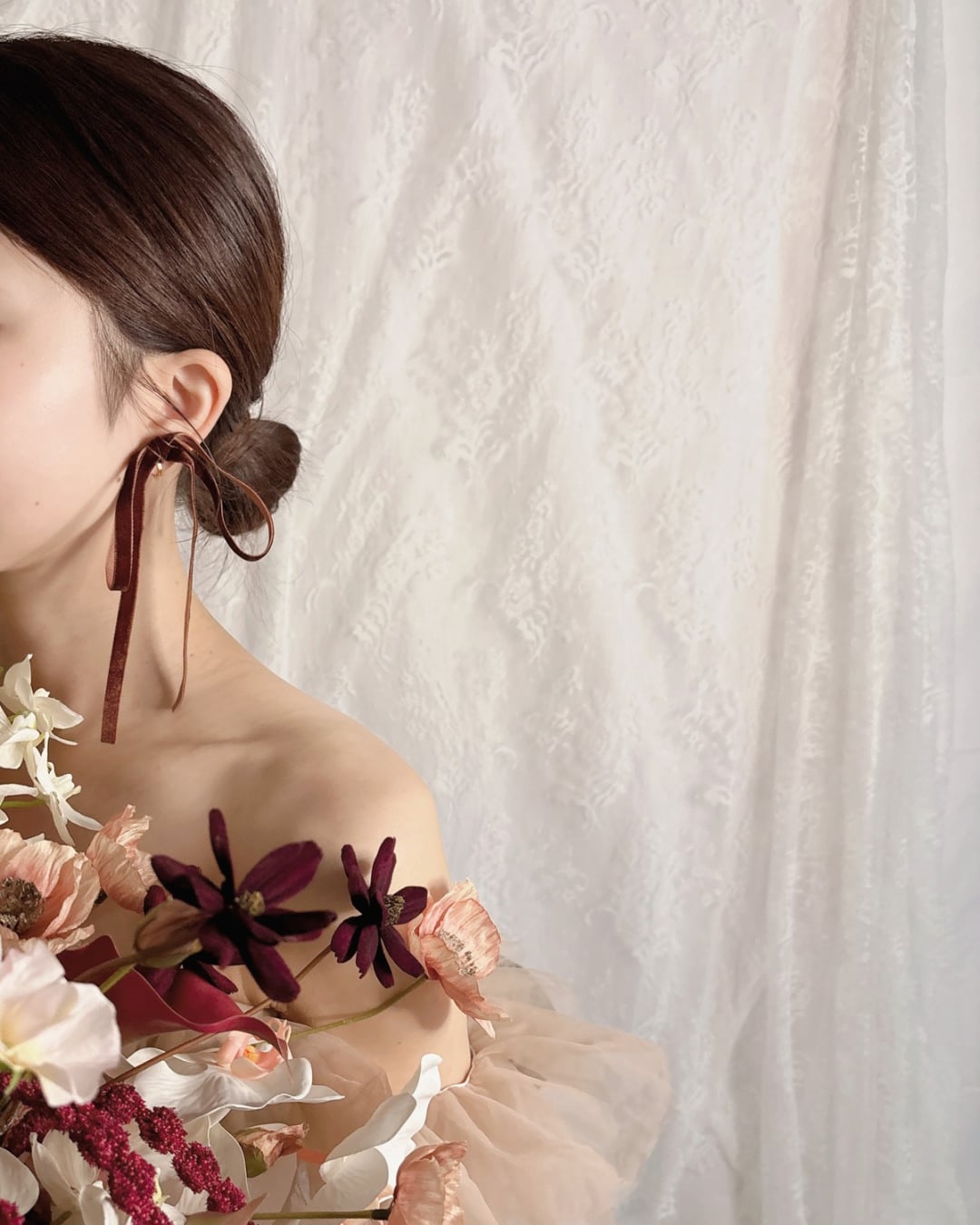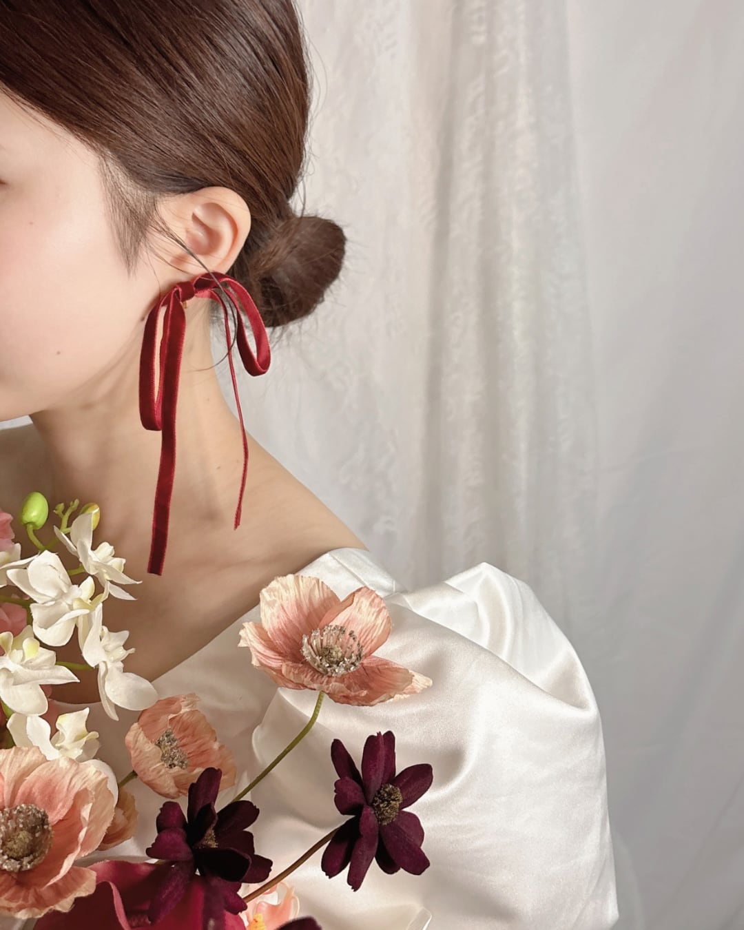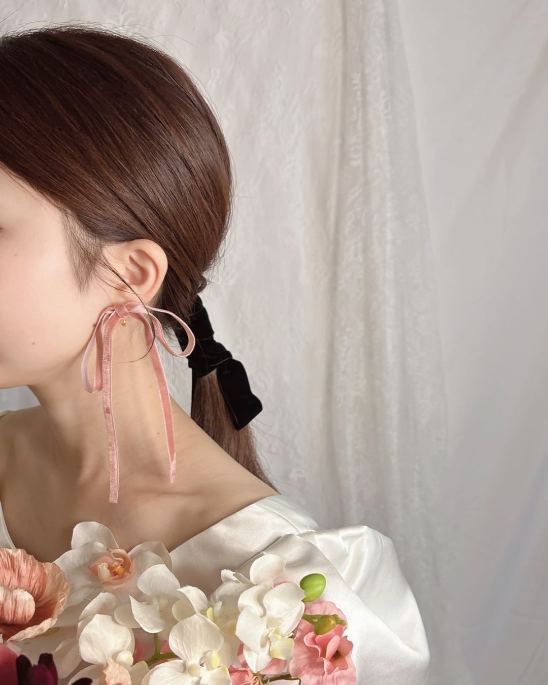 左耳には、ゆったりと流れるように垂れ下がるベロアリボンを♡